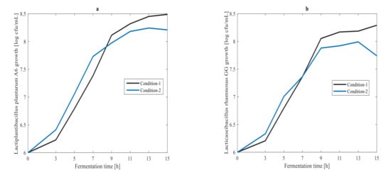 Off-line measured results of LPA6 and LCGG cell growth and concentrations of glucose and lactic acid are shown in Figure 1 and Figure 2, respectively. The fermentation of the teff-based substrate (hereinafter ‘substrate’) inoculated with mixed strains of LPA6 and LCGG predominantly had glucose (consumed substrate) and lactic acid (produced metabolite) []. Under condition 1, LPA6 and LCGG growth did not decline over fermentation time. Under condition 2, however, growth of both microbes began declining after 13 h of fermentation (Figure 1). Under condition 1, LPA6 and LCGG growth increased from 6 log cfu/mL to 8.49 and 8.29 log cfu/mL, respectively. Conversely, under condition 2, growth of LPA6 and LCGG decreased between 13 to 15 h fermentation from 8.24 to 8.21 log cfu/mL and from 7.99 to 7.74 log cfu/mL, respectively. At this decreasing point of cell growth, the main substrate glucose was not consumed entirely. Thus, the reason for declining cell growth appears to be due to the development of an acidic environment.
