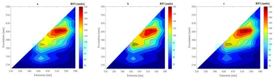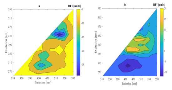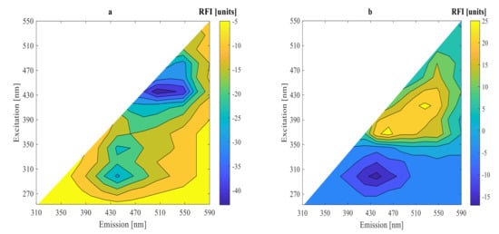 For a better understanding of the fluorescence spectra variations, difference spectra were calculated by subtracting the initial spectrum from the spectra of 9 and 15 h fermentations (Figure 5 and Figure 6). The highest peak difference was observed in the protein fluorescence region at excitation (270–290 nm) and emission (310–390 nm) for all fluorescence spectra in 9 h fermentation. The other highest peak differences were observed in the fluorescence regions of riboflavin at excitation (410–450 nm) and emission (510–570 nm) and NADH for all fluorescence spectra in 15 h fermentation. The difference fluorescence spectra under condition 1 had a higher intensity as compared to the difference fluorescence spectra under condition 2. The difference and original fluorescence spectra showed peaks in the same regions. However, different fluorescence intensities were observed. These variations in the fluorescence intensities are due to differences in substrate concentration used under the two different fermentation conditions. The fluorescence intensities decreased from their initial values during the 9 h fermentation in all fluorescence regions. However, the fluorescence intensities increased during the 15 h fermentation in the regions of riboflavin and NADH.