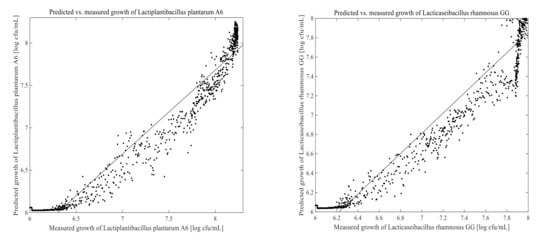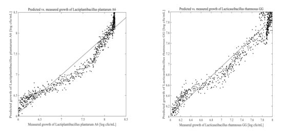 Predicted vs. measured cell growth in the fermentation of 4 g/100 mL of substrate inoculated with mixed strains of 6 log cfu/mL Lactiplantibacillus plantarum A6 and Lacticaseibacillus rhamnosus GG; predicted with artificial neural networks using five hidden neurons.