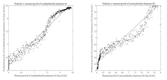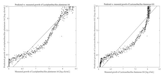 Predicted vs. measured cell growth in the fermentation of 7 g/100 mL of substrate inoculated with mixed strains of 6 log cfu/mL Lactiplantibacillus plantarum A6 and Lacticaseibacillus rhamnosus GG; predicted with artificial neural networks using five hidden neurons.