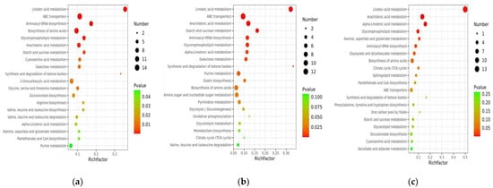 KEGG analysis of the DEMs in (a) F CK0/36 CK0; (b) F 2 min/36 2 min; and (c) F 15 min/36 15 min. Note: The ordinate refers to metabolic pathway; abscissa is the enrichment factor (Enrichment factor = the number of metabolites with significant difference/the number of total metabolites in the pathway). The color change from red to green means that the p-value increases successively.