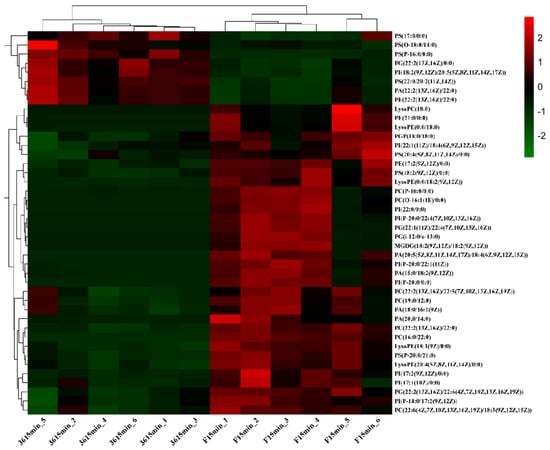 Heat map of membrane lipid content difference of fresh-cut eggplant in F 15 min/36 15 min. Note: Hierarchical clustering of DEMs (p < 0.05 and VIP > 1 were considered as DEMs between two groups). The rows in the heat map represent metabolites, and the columns represent different samples. Up-regulated metabolites are indicated in red and down-regulated metabolites in green.