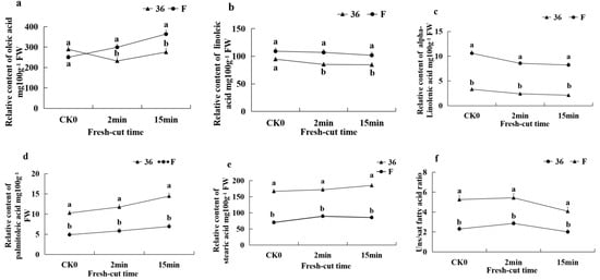 Five major fatty acids were identified, comprising three unsaturated fatty acids (USFAs), oleic acid, linoleic acid, linolenic acid, and two saturated fatty acids (SFAs), palmitic acid and stearic acid. Between ‘36′ and ‘F’, there were significant differences in the relative content of the three types of USFAs and two types of SFAs. The relative content of USFAs in ‘F’ fruit was significantly higher than in ‘36′ fruit. (Figure 4a–c). However, in contrast to the USFAs, the relative content of SFAs in ‘F’ fruit was significantly lower than that in ‘36′ fruit (Figure 4d,e). Similarly, the ratio of unsaturated to saturated fatty acids (U/S) were significantly higher in ‘F’ than those in samples for ‘36′ fruit (Figure 4f).