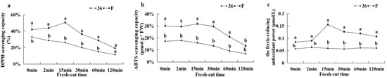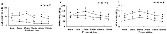 Figure 10 shows the antioxidant capacity and antioxidant enzyme activities of CAT, APX, and SOD after cutting the eggplant. The DPPH radical scavenging ability, ABTS radical scavenging ability, and the scavenging ability of FRAP of eggplant material ‘F’ showed a trend of increasing and then decreasing after cutting, while the DPPH radical scavenging ability and ABTS radical scavenging ability of eggplant material ‘36′ showed a decreasing trend after cutting and no significant change in the scavenging ability of FRAP. The overall antioxidant capacity of ‘F’ was significantly higher than that of ‘36′ fruits throughout the browning process of fresh-cut fruits (Figure 10a–c). After cutting, the APX and SOD activities of both eggplant fruits showed a tendency to increase and then decrease, with the SOD activity of ‘F’ reaching a maximum at 15 min and the APX activity of ‘36′ fruit reaching a maximum at 2 min in both cases. The change in CAT activity of ‘F’ fruit with increasing fresh-cutting time was consistent with APX, while CAT activity of ‘36′ fruit decreased slowly. The CAT, SOD, and APX activities of ‘F’ fruit were significantly higher than those of ‘36′ fruit after cutting (Figure 10d–f), indicating that increasing antioxidant enzyme activities helped to ameliorate browning of fresh-cut eggplant.