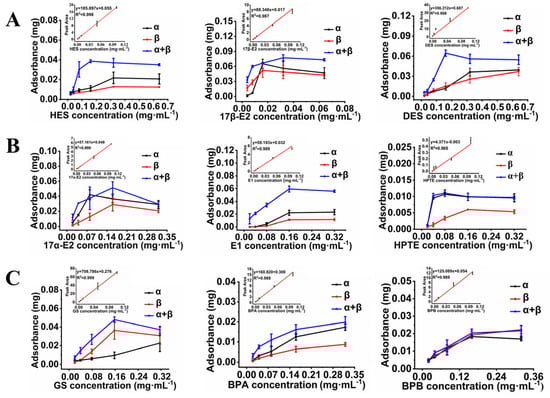 Adsorption capacity of SPE columns prepared with ERα, ERβ, and ER cocktail for EDC adsorption. (A) The adsorption capacity of DES, 17β-E2, and HES with high estrogenic activities. (B) The adsorption capacity of 17α-E2, E1, and HPTE with moderate estrogenic activities. (C) The adsorption capacity of BPA, BPB, and GS with low estrogenic activities. Inset: standard curves of nine EDCs determined by HPLC.