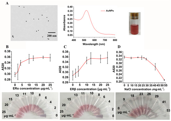 Characterization of AuNPs and optimization of AuNPs-ER cocktail colorimetric assay. (A) TEM image, UV-visible spectrum, and photograph of the synthesized AuNPs. Optimization of the concentration of ERα (B) and ERβ (C) by absorbance values at 520 nm and photograph in the presence of 7.6 mg·mL−1 NaCl. (D) Optimization of the concentration of NaCl added in AuNPs in the presence of ER cocktail.