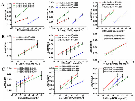 The standard curves of nine different estrogenic activity EDCs including linear range and linear relationship based on different ER colorimetric methods. (“Red line” represents AuNPs-ER cocktail colorimetric assay; “Green line” represents AuNPs-ERα colorimetric assay; “ Blue line ” represents AuNPs-ERβ colorimetric assay). (A) The standard curves of DES, 17β-E2, and HES with high estrogenic activities. (B) The standard curves of 17α-E2, E1, and HPTE with moderate estrogenic activities. (C) The standard curves of BPA, BPB, and GS with low estrogenic activities.