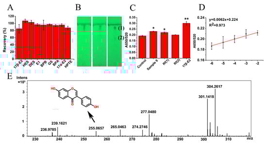 (A) The recovery results of milk spiked into nine EDCs analyzed by AuNPs-ER cocktail colorimetric assay. (B) The separation of unknown EDCs by TLC from dairy products. (C) Estrogenic activity of EDCs in dairy products demonstrated by AuNPs-ER cocktail colorimetric assay. (* indicate statistically significant differences between groups (p < 0.05), n = 3, ** indicate statistically significant differences between groups (p < 0.01), n = 3. (D) The standard curve of daidzein was obtained by AuNPs-ER cocktail colorimetric assay. (E) The mass spectrometry of unknown EDC substances with higher estrogenic activity isolated from dairy products.