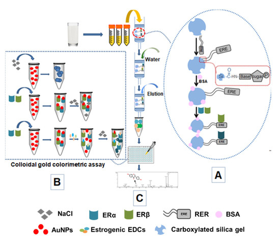 A AuNPs-ER cocktail colorimetric assay equipped with an SPE column based on an ER cocktail was designed to rapidly screen EDCs in the complex food matrix. The ER cocktail can protect AuNPs from a salt-induced aggregation [8,14] in a colorimetric assay that uses AuNPs as colorimetric probes. An SPE column was prepared to enrich and purify EDCs in the sample based on the immobilized ER cocktail by the estrogen response element (ERE) that maintains maximum ER activity (Scheme 1A). For the positive samples, the ER cocktail can bind specific purified EDCs, which makes AuNPs lose the protection of the ER cocktail and a large quantity of salt approach the AuNPs to induce their aggregation (Scheme 1B). The characteristic absorption peak of AuNPs was shifted as the aggregation took place, and then the absorbance values ratio of before and after aggregation was calculated to detect EDCs. Moreover, a substance with estrogenic activities was screened, separated, and identified by mass spectrometry (Scheme 1C). Accordingly, the prepared SPE column using the ER cocktail could enrich trace amounts of EDCs and reduce the interference of matrix in dairy products. The developed AuNPs-ER cocktail colorimetric assay realized high-throughput analysis of known EDCs and screening of unknown EDCs in dairy products. Compared with the recombinant cell lines with the dual-ER (ERα and ERβ) method established by Brennan, J. C. et al. [11] for EDC screening, this proposed method was more convenient, time-saving, and achieved a wider recognition range for EDC screening.
