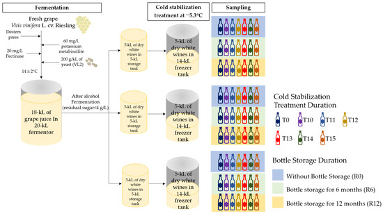 According to the standard procedures of the winery, the cold stabilization treatment of dry white wine should last for 15 days. In this study, the sampling was conducted before cold stabilization and at 10, 11, 12, 13, 14, and 15 days of cold treatment (respectively marked as T10, T11, T12 T13, T14, and T15). To avoid the redissolution of the tartaric precipitation, the wine sample was collected in a one-liter thermos flask and was quickly filtered with the diaphragm vacuum pump and a 0.45 μm filter membrane. Then, we sampled 750 mL of wines by a one-liter cylinder and immediately poured them into the standard green glass bottles. After being manually sealed with natural corks, the bottle mouths were wrapped with shrinkable polyvinyl chloride (PVC) capsules. Then, the samples were all laid down to minimize the infiltration of external oxygen and stored in the wine cellar. The cellar temperature was kept at 14–16 °C all year round, and the relative air humidity was about 70%. A total of 63 bottles of wines were used for this study and three bottles were taken out per treatment group after cold treatment, and at 6 months and 12 months of bottle storage, respectively (Figure 1). Every bottle of the sample was applied in the determination of organic acid, aroma compounds, and sensory evaluation.