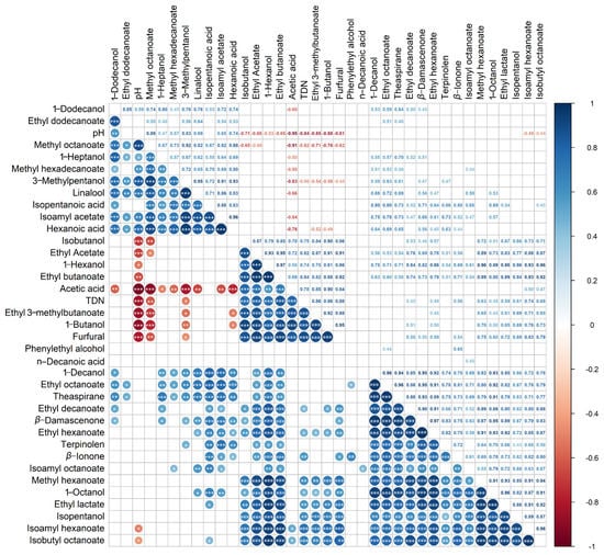 Correlation analyses between the pH value and the concentration of individual aroma compounds and between different aroma compounds. The “*”, “**”, and “***” represented that the correlations were statistically significant, which means p < 0.05, p < 0.01, p < 0.001, respectively.