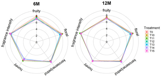 At 0 and 6 months of bottle storage, the OAVs of both the fruity and floral smells had no significant difference between the cold treatment wines and the control group except for the floral OAV at 6 months of bottle storage. After bottle storage for 12 months, all cold treatments significantly increased the fruity and floral OAVs, which was related to the increase in the concentrations of ethyl esters, β-damascenone, β-ionone, and others (Table S1). These compounds provide the fruity and floral aroma [20]. Compared with the control group without cold treatment, the OAV corresponding to the kerosene smell was significantly increased in the T14 and T15 wines at the end of the cold treatment (R0), and in the wines with cold treatments over 12 days (T12–T15) after bottle storage for 6 months, respectively. Moreover, the OAV of kerosene steadily increased during bottle storage and no statistical difference existed among the treated wines at the 12-month point of bottle storage, which was closely related to the increase of TDN concentration (Table S1). The kerosene was provided by TDN in Riesling wines [22]. The honey smell is characterized by phenylethyl alcohol in this study [20]. The OAV corresponding to the honey smell increased in the T11, T13, and T15 wines at the end of cold treatment (R0), and in the cold treatment wines, except for T11 and T13, 6 months after bottle storage. But at 12 months of bottle storage, these differences all disappeared, even though the OAV corresponding to the honey aroma was too low, so the variation did not influence the wine aroma sensory characteristics. Regarding aroma sensory evaluation, various aroma characteristics did not show statistical differences between the different groups at the 6-month and 12-month points of bottle storage (Figure 5).