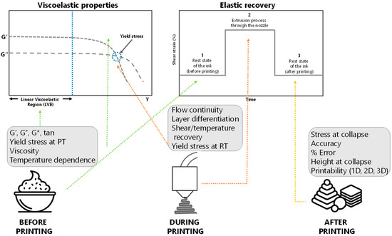 | tan (δ) = G’’/G’ | - | High values indicate a fluid-like behavior, and low values a solid-like behavior. So, if G’ ≥ G’’, then a resistance against collapse and a better holding of shape after printing is observed. |