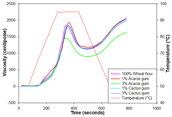 RVA profiles of wheat flour blends with acacia and cactus gums.