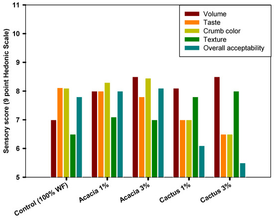 The sensory qualities of leavened baked goods are primarily determined by the volume, color, flavor, texture, and overall acceptability of the end product to replicate consumer preferences [32]. The means of the hedonic scores for the sensory measures listed above are shown in Figure 4. In terms of volume, the bread made with various blends of wheat flour and gums came in first place. The bread made with 3% cactus gum and acacia gum came in second place. This preference for bread with a higher gum concentration may be explained by the crumbs’ thin-walled yet extended air cells (Figure 1). The participants’ least preferred samples remained the bread with lower gum concentrations and the control bread. The sensory data on bread volume preference agreed with the volume data, which showed that when gums were added at 3%, the volume rose.