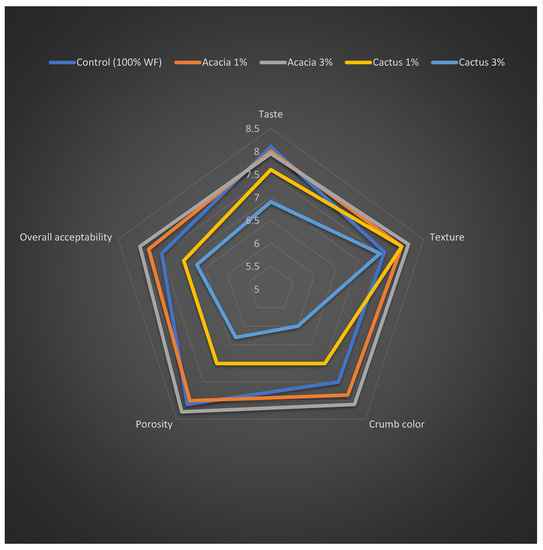 The pictures of the cake samples baked with or without the presence of gums are presented in Figure 3, whereas the means of the hedonic scores for the sponge cakes are displayed in a spiderweb graph (Figure 5). In terms of flavor, the control sample was the most preferred, and the presence of gums resulted in the counterparts receiving a lower ranking. Similar to the bread, the cake with cactus gum remained unpopular, particularly in higher quantities (3%). By and large, the presence of gums in food systems enables a more gradual release of flavoring chemicals during mastication [48]. However, after a certain level of gum is reached, the normal flavor of the cake becomes bland or less rich, which has a detrimental effect on consumer preference [13]. As with the bread sample, the cake’s crumb color was preferred when 3% acacia gum was added. On the other hand, adding 3% cactus gum produced the least-acceptable color. Similarly, the cake containing 3% acacia received the highest rating for color choice, followed by the control cake. Nonetheless, the addition of cactus gum, particularly at a concentration of 3%, reduced the cake’s texture acceptability, earning it only 7.5 out of a possible 9 points. Prior to this, we found that adding 2% gum Cordia to cakes made them look and taste bad [33].