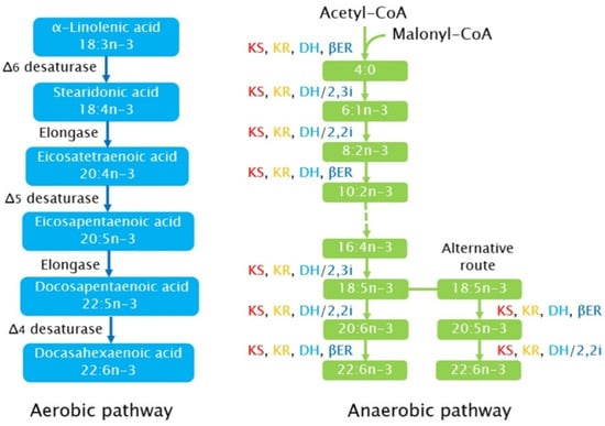 A schematic illustration of the aerobic and anaerobic pathways assumed for microalgae. For the anaerobic pathway, enzymes involved are the 3-ketoacyl synthase (KS—red), 3-ketoacyl reductase (KR—orange), dehydrase/isomerases (DH—light blue), DH/2,2i = dehydrase 2-trans, 2-cis isomerase, DH/2,3i = dehydrase 2-trans, 3-cis isomerase, and enoyl reductase (βER—blue). (Modified from figures in [1,10,78].