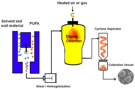 Although there are several advantages, some drawbacks are linked to microcapsules prepared using spray-drying technology. Since the spray-drying process in the food industry is typically carried out using aqueous formulations, shell materials must have sufficient water solubility [290,310,311]. The fine powder produced in the spray-drying process can expose an explosion hazard to the surrounding areas and needs to be safely managed. In addition, high temperatures involved in the spray-drying process result in the oxidation of unsaturated fatty acids, especially PUFA, and other biomolecules that are sensitive to oxidation, consequently compromising the storage stability of oils [290].