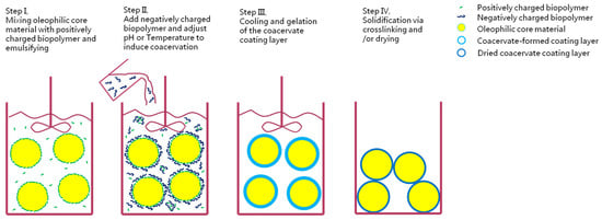 Complex coacervation is a phase-separation process in which the attractive electrostatic interactions drive oppositely charged biopolymers to form tiny aggregated colloidal particles [320,321]. Complex coacervation process generally consists of four steps (Figure 3), which are emulsification, coacervation, cooling/gelation, and solidification [322,323]. Among the various proteins and polysaccharides, gelatin and Arabic gum are the most widely studied and a pair of wall materials are used in the complex coacervation [293,295,297,324,325]. Nowadays, there is a trend to replace animal proteins with plant proteins in microencapsulating PUFA-rich oils [322]; soybean and pea protein isolates are the most commonly used plant proteins [326,327,328,329]. A formation of complex coacervation using chia seed protein isolate and chia seed gum has also been explored [330]. The same group has also used CPI-CSG (Chia seed protein isolate and chia seed gum) complex coacervates to microencapsulate PUFA-rich oils [330,331]. Complex coacervation technology has a higher embedding rate and can effectively protect ingredients that are senstive to oxidation, offering better emulsification and stability of the target comounds, although its process is complex and involves strict control point requirements and a high cost.