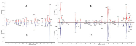 Typical total ion chromatogram (TIC) of SHLE before fermentation ((A): positive ion mode; (C): negative ion mode) and SHLE after fermentation ((B): positive ion mode; (D): negative ion mode).