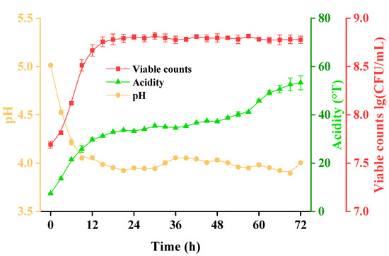 The number of living bacteria in the sample was determined by the plate colony counting method. The pH value was measured by an FE20 pH meter (METTLER TOLEDO Int. Ltd., Zurich, Switzerland). The pH meter was calibrated with pH 4.01 and 6.86 standard buffer solutions before use. The determination method of titration acidity was as follows: Weigh a 5 g sample and titrate by 0.1 mol/L NaOH solution until a pH value up to 7.0 is achieved. The number of milliliters of NaOH solution used ×20 is the acidity value of the sample (°T).
