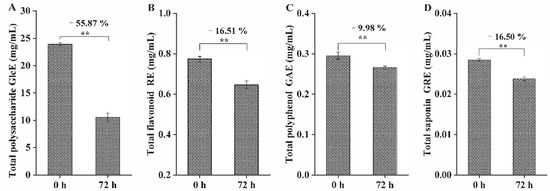 Changes in functional components in SHLE fermented by L. fermentum grx08 at 0 h and 72 h. (A) Total polysaccharide content (TPSC). Data are expressed as mg of glucose equivalent (GlcE) per mL of SHLE; (B) total flavonoid content (TFC). Data are expressed as milligrams of rutin equivalent (RE) per mL of SHLE; (C) total polyphenol content (TPC). Data are expressed as mg of gallic acid equivalent (GAE) per mL of SHLE; (D) total saponin content (TSC). Data are expressed as mg of ginsenoside Re equivalent (GRE) per mL of SHLE. Data are reported as the mean ± standard error of the mean (SEM). ** indicates that there was a significant difference between 0 h and 72 h (p < 0.01).