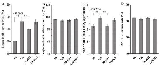 Effects of L. fermentum grx08 fermentation on the functional characteristics of SHLE at 0 h and 72 h. (A) Inhibition of lipase activity; (B) inhibition of α-glucosidase activity; (C) total antioxidant capacity (FRAP); (D) DPPH· scavenging rate. Data are expressed as the mean ± standard deviation (SEM). ** p < 0.01 indicates that there was a significant difference between 0 h and 72 h. FRAP, ferric reducing-antioxidant power. “0 h pH 4” means lactic acid was used to adjust the extraction solution for fermentation for 0 h to the pH value of 4. Positive controls: Orlistat, 0.5 mg/mL. Acarbose, 0.001 mg/mL. Vc(0.2), 0.2 mg/mL vitamin C. Vc(0.32), 0.32 mg/mL vitamin C.
