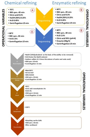 As reported in Figure 1, the experimental process (enzymatic) differed from the traditional one (chemical) mainly in the operating conditions adopted during degumming (phase 1 and 2 of the whole process), while the different experimental lines continued in the same way, starting from phase 3 until the end of the refining process.