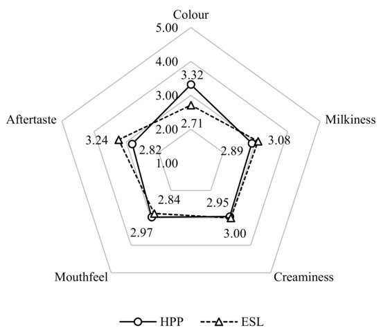 In general, the sensory quality of HPP milk has been reported to be better than that of heat-treated milk. The organoleptic properties of milk have improved with higher acceptability scores due to reduced proteolytic activity after undergoing high pressure treatments at 400 MPa for 15 min [47], higher aroma and acceptability of HPP milk treated at 450–650 MPa for 3 min over pasteurised milk [48], and a different aroma profile in HPP milk at 600 MPa for 5 min compared to LTLT milk (63 °C for 30 min) due to higher levels of ketones [49]. Andrés et al. [48] added that HPP-treated milk was almost similar to untreated milk. The objective of this study was to evaluate the sensory properties of HPP treatment of milk at 600 MPa for 10 min in comparison with thermal treatment at 125 °C for 4 s for overall milk acceptance and in terms of colour, milkiness, creaminess, mouthfeel, and aftertaste attributes.