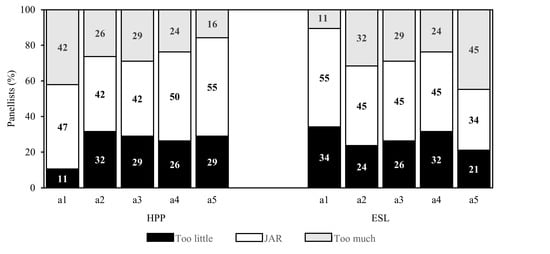 Percentage of panellists based on the collapsed JAR levels of the sensory attributes colour (a1), milkiness (a2), creaminess (a3), mouthfeel (a4), and aftertaste (a5) for HPP and ESL milk.