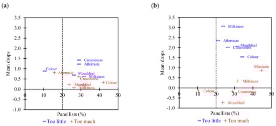 Mean drop plots for (a) HPP and (b) ESL milk. The dashed line represents the boundary of 20% of panellists.