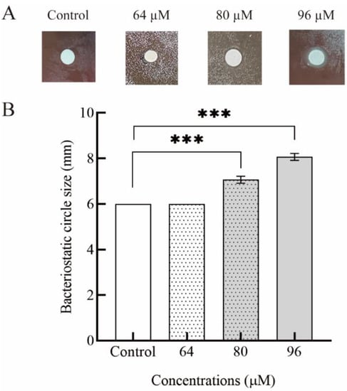 The diameter of the inhibition zone (DIZ) was determined by the filter paper diffusion method. The plates with H. pylori and PLNC8 were incubated at 37 °C in a microaerobic environment for 72 h. (A) Inhibitory effect of 0, 64, 80, and 96 μM PLNC8 on H. pylori ZJC03. (B) Inhibitory effect of different concentrations of PLNC8 on H. pylori ZJC03; Control: 0.05% acetic acid buffer; Data are shown as the mean ± SD; n = three groups parallel. *** p < 0.001; no statistical significance was shown.