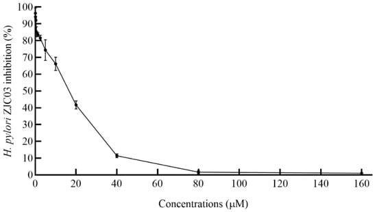 Measuring the bacteriostatic circle was the most intuitive method to detect whether the sample had the effect of inhibiting pathogenic bacteria [40]. Figure 1 shows the inhibition ability of various concentrations of PLNC8 against H. pylori ZJC03 and the diameter of its inhibition zone. The inhibition zones of high concentrations of PLNC8 were more obvious, indicating that PLNC8 had the potential ability to inhibit H. pylori ZJC03 growth. As shown in Figure 1B, an obvious transparent inhibition zone was observed at a concentration of 80 μM (7.06 ± 0.15 mm) but not at a concentration of 64 μM (6.00 ± 0.00 mm). It was observed in the inhibition zone that the inhibition concentration of PLNC8 on H. pylori ZJC03 was between 0–160 μM. In order to further verify its MIC, the method described in Section 2.4 was repeated three times and the inhibition rate of PLNC8 was determined. The results are shown in Figure 2. The MIC was defined as the lowest concentration at which the indicator bacterium showed an extremely small number of colonies or no growth [31,41]. Co-culture of PLNC8 with H. pylori ZJC03 showed that the MIC of PLNC8 was 80 μM. There was no detectable growth at 37 °C after 72 h.