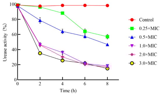In vitro, H. pylori generally cannot exist in environmental conditions below pH = 3.0. If a urea concentration similar to the gastric cavity environment is added, H. pylori is protected [42]. The analysis of the H. pylori gene sequence shows that it may be able to use several substrates as its nitrogen source, including urea, ammonia, and three amino acids (arginine, serine, and glutamate) Ammonia can be produced by the decomposition of urea by urease [43]. This makes the nitrogen source exist in the form of ammonium ions. It seems that H. pylori can also encode fatty amidase [44], which catalyzes amide decomposition and provides a nitrogen source for bacterial metabolism through ammonia production. Therefore, the urease produced by H. pylori allows it to survive in an acidic environment. H. pylori produced urease and was considered a major causative factor in gastritis and peptic ulcers (a small painful area in the human stomach). As shown in Figure 3, the treatment with different concentrations of PLNC8, showed that the urease activity of H. pylori was negatively correlated with PLNC8 concentration. When the concentration of PLNC8 increased, the urease activity of H. pylori ZJC03 was relatively decreased, from 98.58 ± 0.86% (0.05% acetate buffer) to 25.68 ± 1.36% (3.0×MIC), and the urease activity was stable after the H. pylori ZJC03 strain had been treated with PLNC8 for 4 h. It was speculated that PLNC8 inhibits the growth of H. pylori ZJC03 and that the measured urease activity was lower than that of the control group. Therefore, PLNC8 can inhibit the growth of H. pylori ZJC03.