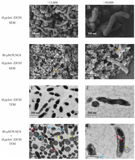 SEM and TEM were used to observe the microscopic structural changes in H. pylori ZJC03 treated with PLNC8 after 4 h at 37 °C. SEM (×15,000) observation is shown in pictures (A,C). SEM (×30,000) observation is shown in pictures (B,D). TEM (×15,000) observation is shown in pictures (E,G). TEM (×30,000) observation is shown in pictures (F,H). (A,B,E,F) H. pylori ZJC03 cells without treatment. (C,D,G,H) H. pylori ZJC03 cells treated with PLNC8. Broken cytoplasm (blue arrow), cell wall separation (yellow arrow), cell collapse (white arrow), cell lysis (orange), and cell perforation (red arrow).