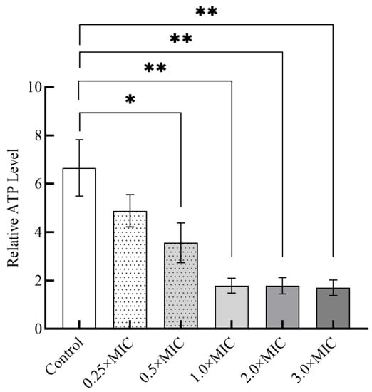 Effects on ATP levels in H. pylori ZJC03. ATP of H. pylori ZJC03 co-cultured with different concentrations of PLNC8 for 30 min; Control: 0.05% acetic acid buffer; Data are shown as the average ± SD; n = three groups parallel. * p < 0.05 and ** p < 0.01; there was no significant difference if it was not marked.