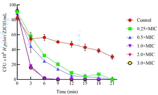 It has been shown that H. pylori infection led to increased levels of reactive oxygen species (ROS), oxidative DNA damage, and activation of oncogenic signaling pathways and is involved in gastric carcinogenesis [49,50]. Catalase was found to be potentially important for the growth and survival of H. pylori. The susceptibility of H. pylori ZJC03 to hydrogen peroxide lethality was assessed with and without PLNC8 treatment. Figure 6 shows that the viability of H. pylori ZJC03 treated with 1.0, 2.0, and 3.0×MIC PLNC8 disappeared within 9 min, whereas the viability of H. pylori ZJC03 without treatment decreased slightly and remained steady throughout the entire 21-min incubation period. The control group decreased slightly. Based on these results, it is speculated that H. pylori ZJC03 needs a strict microaerobic environment to maintain its activity. During the experiment, although H. pylori ZJC03 cells were able to change shape as a self-protection mechanism, some bacteria still died.