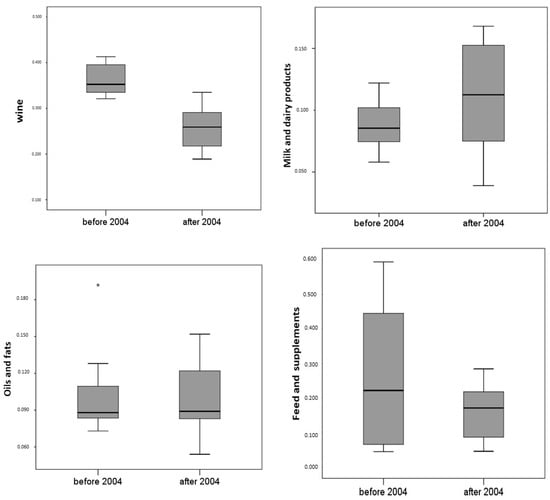 Examining Table 4, we can note that statistically significant differences were observed. Relating to “wine”, “honey” and “sowing seeds” sectors, dispute rates before 2004 were significantly higher than in the subsequent period (p = 0.001, p = 0.047, and p = 0.001, respectively); on the contrary, the “meat” sector before 2004 presented dispute rates significantly lower than the subsequent period (p = 0.001); the other sectors, “milk and dairy products”, “oils and fats”, “feed and supplements”, “eggs” and “vegetable preserves”, show slight variations in the rates for the two periods which are not statistically significant (p > 0.050).