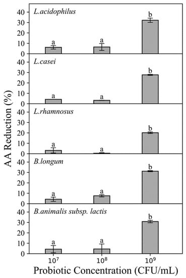 3.1.1. Effects of Probiotic Strains, AA Concentration and Probiotic Concentration