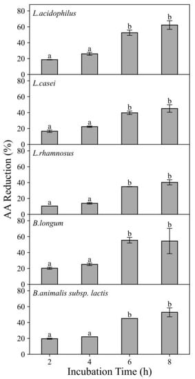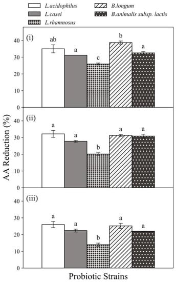 3.1. Acrylamide Reduction by Probiotics in Chemical Solution