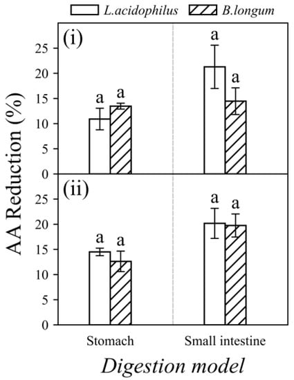 3.3. Acrylamide Reduction by Probiotics in Food Matrices under In Vitro Digestion