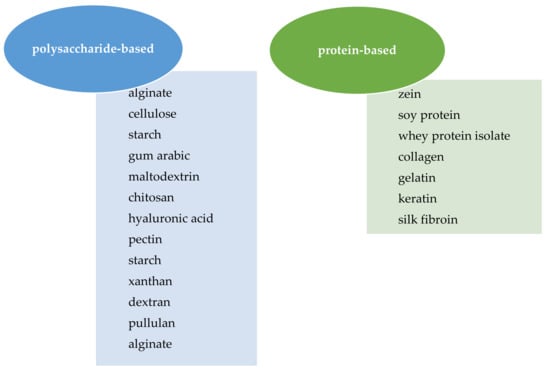 Biopolymers such as chitosan, gum arabic (GA), alginate, maltodextrin, starch, zein, whey protein, or combined polymers are useful materials for entrapment and have been used by the scientific community as wall materials in the food and nutraceutical industries due to their biodegradability and low toxicity (Figure 2) [,].