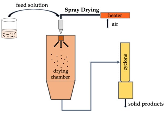 Spray drying is the most used technique for the fabrication of microencapsulation structures due to its simplicity, quickness, and scale-up potential (Table 2). It is an important technique used in the food industry to protect bioactive compounds against light, temperature, and oxidation allowing for good stability of the produced structures. This method involves several steps as shown in Figure 3.