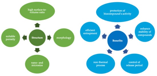 Electrohydrodynamic techniques—electrospinning and electrospraying—are simple and versatile encapsulation techniques (Table 2) that have been used in several applications such as pharmaceutical, drug delivery, wound dressings, and tissue engineering. They allow the production of microstructures without significant toxic effects on the environment. In food and nutraceutical applications, these techniques were less studied but have been the focus of attention by the scientific community. They are known for their simplicity to fabricate fibers and particles with different physicochemical properties and different polymers with high scale-up potential []. These techniques present the capacity to fabricate structures and entrap hydrophobic and hydrophilic ingredients providing their stability (Table 2). This technology is focused on a high surface-to-volume ratio and efficient functionalized structures (Figure 4).