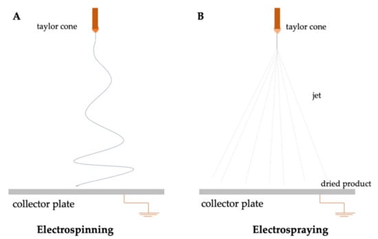 The electrospinning technique involves a spinneret, a collector, and a high voltage source. Briefly, an applied voltage to the polymer solution induces a charged jet ejected from a Taylor cone (Figure 5A) []. The cone is achieved due to the absence of the balance of the electric forces and surface tension []. In the case of the electrospraying process, the polymer concentration is low enough to destabilize the jet and the two instabilities (Rayleigh and whipping) allow the formation of fine and highly charged droplets (Figure 5B). The former results from the surface tension of the solution which tends to minimize the surface area []. As a result, fibers and particles are collected, respectively. Factors such as the spinnability, production of fibers or particles, and diameter of the microstructures are affected by the solution parameters (polymer, viscosity, concentration and molecular weight of polymer, surface tension, solvents), processing variables (applied voltage, flow rate, diameter of needle, collector distance), and environmental parameters (temperature, humidity, airflow) []. These parameters can be adjusted in order to optimize the characteristics and morphology of the micro/nanostructures.