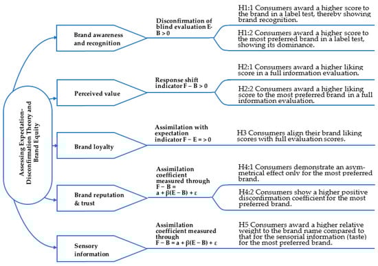 Several authors have analyzed the impact of product credence attributes such as brand, advertisement, packaging, label, price and origin on sensorial expectations [29,30,31,32,33,34,35,36,37,38,39,40]. The application of neuromarketing tools is also a common procedure in this research field [41,42]; however, the reliability of these methods is not yet widely accepted [43]. Scholars, as mentioned earlier, have used Expectation–Disconfirmation Theory (EDT) to assess the influence of credence attributes on the consumer evaluations of several food products. However, to the authors’ knowledge, this theory was not used previously to measure trust based on brand expectations.