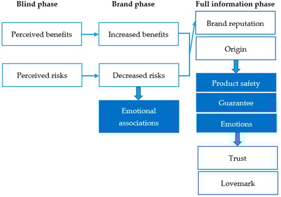 The dimensions that emerged by using the grounded theory methodology are highlighted in Figure 2. The first phase could define the objective features as perceived benefits and risks. The main initial features in the first phase were sensory attributes that were related to taste and described with pairs of contrasts such as “heavy” and “light”, or “dense”, or “sweet” and “bitter”. Uncertainty occurred in the use of grammatical structures like “maybe”, “probably”, and “seemed to”. Thus, the first phase could theoretically be coded as perceived benefits and risks. In the brand phase, perceived benefits have increased, and perceived risks have clearly reduced. Negative associations decreased overall, and words expressing emotions such as “enjoy” have appeared. The full information phase shows that brand reputation could support product evaluation. In the full information phase, uncertainty decreased significantly.
