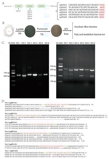 sgRNA design and screening. (A) Schematic illustration of the sites and sequence of sgRNA. Red is the PAM sequence. (B) Outline of the experimental protocol. Lip2000—transfection reagents; Puro—puromycin; ATV—cell dissociation solution. (C) Target fragment amplification and cutting efficiency. DL2000—DNA marker; NO.1—cells knockout by sgRNA 1; and others in the same way. NO.1 = 168 bp + 419 bp, NO.2 = 361 bp + 226 bp, NO.3 = 296 bp + 291 bp, NO.4 = 297 bp + 290 bp, NO.5 = 291bp + 296 bp, NO.6 = 328 bp + 259 bp. (D) Genotypes of sgRNA knockout. The first line was a wild-type sequence, with red indicating a sgRNA sequence and green indicating a PAM sequence, and the proportion of detected genotypes was displayed on the right side.