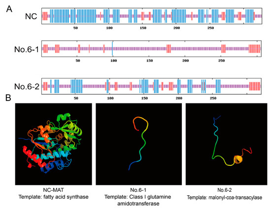 The bioinformatics analysis of MAT knockout efficiency. (A) Secondary structure analysis. NC—negative control cells; NO.6-1—a genotype of NO.6; NO.6-2—another genotype of NO.6; long vertical line—α-helix; middle vertical line—β-fold; Short vertical bar—irregular curl. (B) Tertiary structure analysis. From N to C, it is red, orange, yellow, green, cyan, blue, and purple, respectively.
