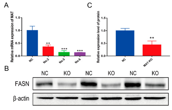 The trial analysis of MAT knockout efficiency. (A) MAT knockout efficiency at mRNA level. NC—negative control cells; NO.1—cells knockout by sgRNA 1; and others in the same way. (B) Protein changes of FASN in knockout cells. KO—MAT-knockout group (C); quantitative analysis of protein; MAT-KO—MAT-knockout group; ** p < 0.01, *** p < 0.001.